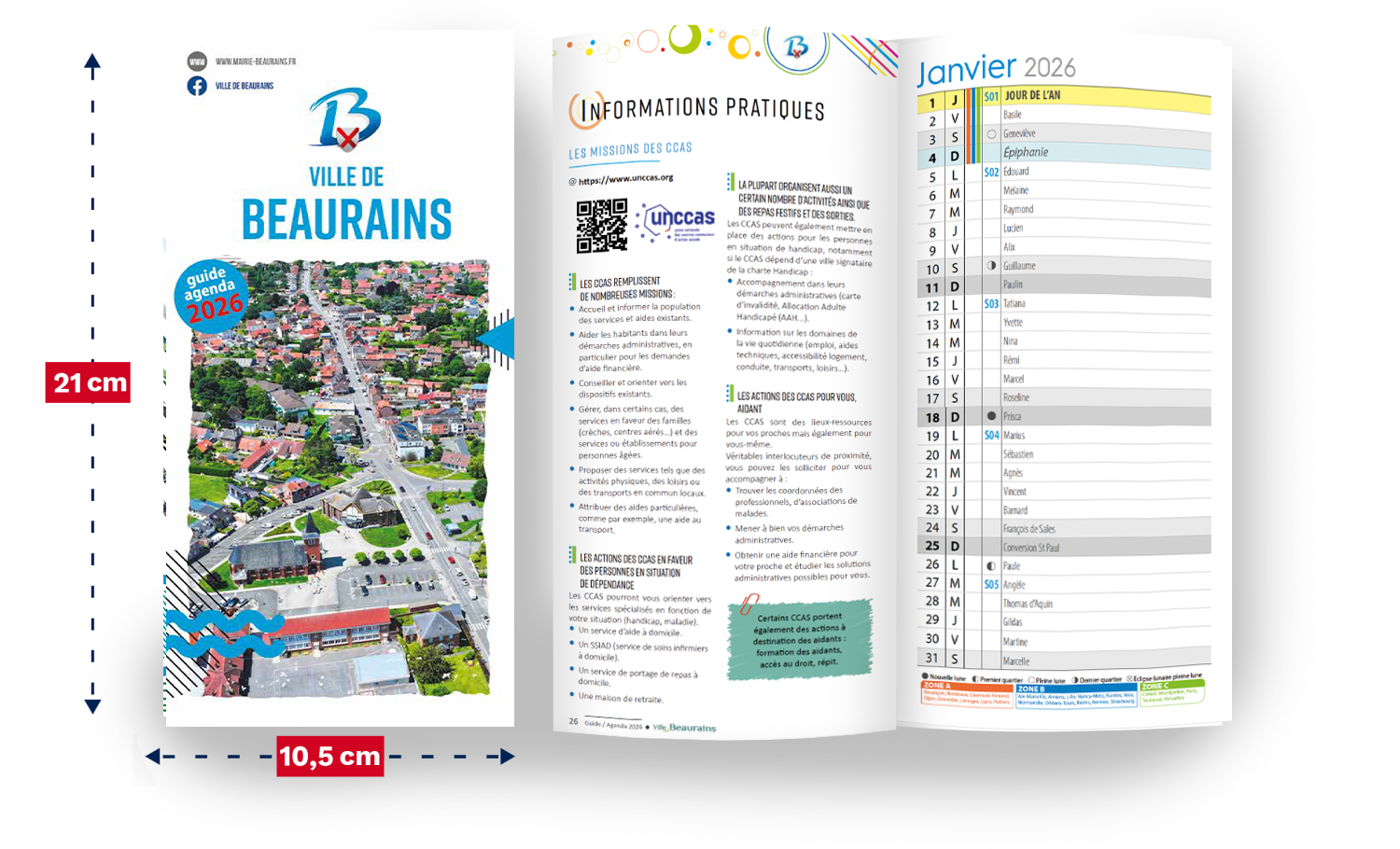 Cet agenda est composé d’un semainier de l’année civile personnalisable en début de chaque mois pour noter vos événements à venir. Viendront se rajouter dans les premières pages les informations de votre collectivité. Distribuez-le en début d’année dans les boîtes à lettres de tous vos administrés.